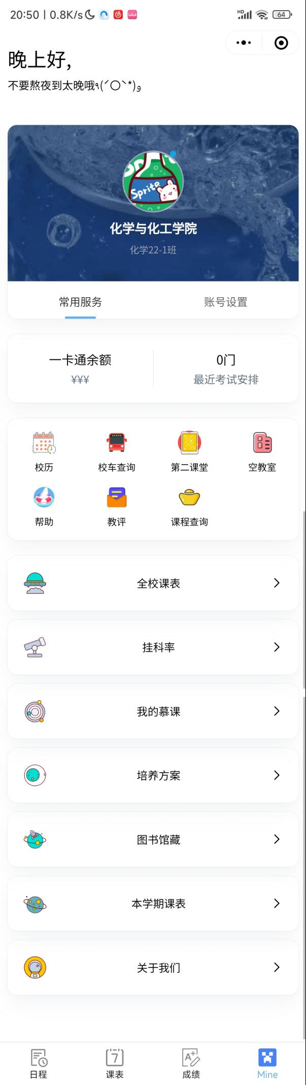 - 学校服务聚合 APP,可查询教务、校园卡、网电费等。