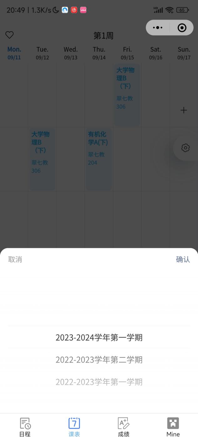 课表界面下点击选择学期,可以查看不同学期的课表。